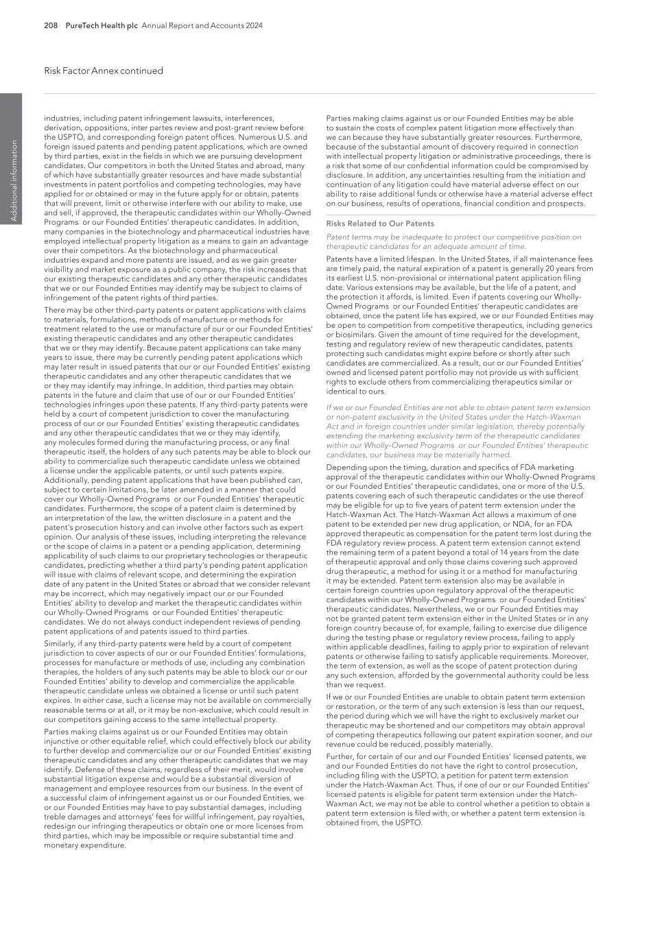 208 PureTech Health plc Annual Report and Accounts 2024 Risk Factor Annex continued A d d it io na l i nf o rm at io n Parties making claims against us or our Founded Entities may be able to sustain the costs of complex patent litigation more effectively than we can because they have substantially greater resources. Furthermore, because of the substantial amount of discovery required in connection with intellectual property litigation or administrative proceedings, there is a risk that some of our confidential information could be compromised by disclosure. In addition, any uncertainties resulting from the initiation and continuation of any litigation could have material adverse effect on our ability to raise additional funds or otherwise have a material adverse effect on our business, results of operations, financial condition and prospects. Risks Related to Our Patents Patent terms may be inadequate to protect our competitive position on therapeutic candidates for an adequate amount of time. Patents have a limited lifespan. In the United States, if all maintenance fees are timely paid, the natural expiration of a patent is generally 20 years from its earliest U.S. non-provisional or international patent application filing date. Various extensions may be available, but the life of a patent, and the protection it affords, is limited. Even if patents covering our Wholly- Owned Programs or our Founded Entities’ therapeutic candidates are obtained, once the patent life has expired, we or our Founded Entities may be open to competition from competitive therapeutics, including generics or biosimilars. Given the amount of time required for the development, testing and regulatory review of new therapeutic candidates, patents protecting such candidates might expire before or shortly after such candidates are commercialized. As a result, our or our Founded Entities’ owned and licensed patent portfolio may not provide us with sufficient rights to exclude others from commercializing therapeutics similar or identical to ours. If we or our Founded Entities are not able to obtain patent term extension or non-patent exclusivity in the United States under the Hatch-Waxman Act and in foreign countries under similar legislation, thereby potentially extending the marketing exclusivity term of the therapeutic candidates within our Wholly-Owned Programs or our Founded Entities’ therapeutic candidates, our business may be materially harmed. Depending upon the timing, duration and specifics of FDA marketing approval of the therapeutic candidates within our Wholly-Owned Programs or our Founded Entities’ therapeutic candidates, one or more of the U.S. patents covering each of such therapeutic candidates or the use thereof may be eligible for up to five years of patent term extension under the Hatch-Waxman Act. The Hatch-Waxman Act allows a maximum of one patent to be extended per new drug application, or NDA, for an FDA approved therapeutic as compensation for the patent term lost during the FDA regulatory review process. A patent term extension cannot extend the remaining term of a patent beyond a total of 14 years from the date of therapeutic approval and only those claims covering such approved drug therapeutic, a method for using it or a method for manufacturing it may be extended. Patent term extension also may be available in certain foreign countries upon regulatory approval of the therapeutic candidates within our Wholly-Owned Programs or our Founded Entities’ therapeutic candidates. Nevertheless, we or our Founded Entities may not be granted patent term extension either in the United States or in any foreign country because of, for example, failing to exercise due diligence during the testing phase or regulatory review process, failing to apply within applicable deadlines, failing to apply prior to expiration of relevant patents or otherwise failing to satisfy applicable requirements. Moreover, the term of extension, as well as the scope of patent protection during any such extension, afforded by the governmental authority could be less than we request. If we or our Founded Entities are unable to obtain patent term extension or restoration, or the term of any such extension is less than our request, the period during which we will have the right to exclusively market our therapeutic may be shortened and our competitors may obtain approval of competing therapeutics following our patent expiration sooner, and our revenue could be reduced, possibly materially. Further, for certain of our and our Founded Entities’ licensed patents, we and our Founded Entities do not have the right to control prosecution, including filing with the USPTO, a petition for patent term extension under the Hatch-Waxman Act. Thus, if one of our or our Founded Entities’ licensed patents is eligible for patent term extension under the Hatch- Waxman Act, we may not be able to control whether a petition to obtain a patent term extension is filed with, or whether a patent term extension is obtained from, the USPTO. industries, including patent infringement lawsuits, interferences, derivation, oppositions, inter partes review and post-grant review before the USPTO, and corresponding foreign patent offices. Numerous U.S. and foreign issued patents and pending patent applications, which are owned by third parties, exist in the fields in which we are pursuing development candidates. Our competitors in both the United States and abroad, many of which have substantially greater resources and have made substantial investments in patent portfolios and competing technologies, may have applied for or obtained or may in the future apply for or obtain, patents that will prevent, limit or otherwise interfere with our ability to make, use and sell, if approved, the therapeutic candidates within our Wholly-Owned Programs or our Founded Entities’ therapeutic candidates. In addition, many companies in the biotechnology and pharmaceutical