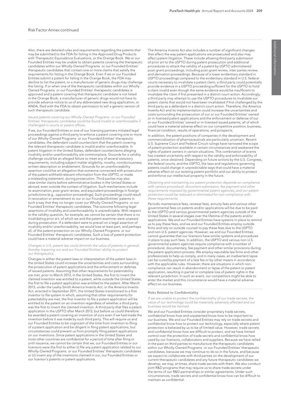PureTech Health plc Annual Report and Accounts 2024 209 Risk Factor Annex continued A d d itio nal info rm atio n The America Invents Act also includes a number of significant changes that affect the way patent applications are prosecuted and also may affect patent litigation. These include allowing third party submission of prior art to the USPTO during patent prosecution and additional procedures to attack the validity of a patent by USPTO administered post-grant proceedings, including post-grant review, inter partes review, and derivation proceedings. Because of a lower evidentiary standard in USPTO proceedings compared to the evidentiary standard in U.S. federal courts necessary to invalidate a patent claim, a third party could potentially provide evidence in a USPTO proceeding sufficient for the USPTO to hold a claim invalid even though the same evidence would be insufficient to invalidate the claim if first presented in a district court action. Accordingly, a third party may attempt to use the USPTO procedures to invalidate our patent claims that would not have been invalidated if first challenged by the third party as a defendant in a district court action. Therefore, the America Invents Act and its implementation could increase the uncertainties and costs surrounding the prosecution of our or our Founded Entities’ owned or in-licensed patent applications and the enforcement or defense of our or our Founded Entities’ owned or in-licensed issued patents, all of which could have a material adverse effect on our competitive position, business, financial condition, results of operations, and prospects. In addition, the patent positions of companies in the development and commercialization of pharmaceuticals are particularly uncertain. Recent U.S. Supreme Court and Federal Circuit rulings have narrowed the scope of patent protection available in certain circumstances and weakened the rights of patent owners in certain situations. This combination of events has created uncertainty with respect to the validity and enforceability of patents, once obtained. Depending on future actions by the U.S. Congress, the federal courts, and the USPTO, the laws and regulations governing patents could change in unpredictable ways that could have a material adverse effect on our existing patent portfolio and our ability to protect and enforce our intellectual property in the future. Obtaining and maintaining our patent protection depends on compliance with various procedural, document submission, fee payment and other requirements imposed by governmental patent agencies, and our patent protection could be reduced or eliminated for non-compliance with these requirements. Periodic maintenance fees, renewal fees, annuity fees and various other governmental fees on patents and/or applications will be due to be paid to the USPTO and various governmental patent agencies outside of the United States in several stages over the lifetime of the patents and/or applications. We and our Founded Entities have systems in place to remind us to pay these fees, and we and our Founded Entities employ outside firms and rely on outside counsel to pay these fees due to the USPTO and non-U.S. patent agencies. However, we and our Founded Entities cannot guarantee that our licensors have similar systems and procedures in place to pay such fees. In addition, the USPTO and various non-U.S. governmental patent agencies require compliance with a number of procedural, documentary, fee payment and other similar provisions during the patent application process. We employ reputable law firms and other professionals to help us comply, and in many cases, an inadvertent lapse can be cured by payment of a late fee or by other means in accordance with the applicable rules. However, there are situations in which non- compliance can result in abandonment or lapse of the patent or patent application, resulting in partial or complete loss of patent rights in the relevant jurisdiction. In such an event, our competitors might be able to enter the market and this circumstance would have a material adverse effect on our business. Risks Related to Confidentiality If we are unable to protect the confidentiality of our trade secrets, the value of our technology could be materially adversely affected and our business would be harmed. We and our Founded Entities consider proprietary trade secrets, confidential know-how and unpatented know-how to be important to our business. We and our Founded Entities may rely on trade secrets and confidential know-how to protect our technology, especially where patent protection is believed by us to be of limited value. However, trade secrets and confidential know-how are difficult to protect, and we have limited control over the protection of trade secrets and confidential know-how used by our licensors, collaborators and suppliers. Because we have relied in the past on third parties to manufacture the therapeutic candidates within our Wholly-Owned Programs or our Founded Entities’ therapeutic candidates, because we may continue to do so in the future, and because we expect to collaborate with third parties on the development of our current therapeutic candidates and any future therapeutic candidates we develop, we may, at times, share trade secrets with them. We also conduct joint R&D programs that may require us to share trade secrets under the terms of our R&D partnerships or similar agreements. Under such circumstances, trade secrets and confidential know-how can be difficult to maintain as confidential. Also, there are detailed rules and requirements regarding the patents that may be submitted to the FDA for listing in the Approved Drug Products with Therapeutic Equivalence Evaluations, or the Orange Book. We or our Founded Entities may be unable to obtain patents covering the therapeutic candidates within our Wholly-Owned Programs or our Founded Entities’ therapeutic candidates that contain one or more 