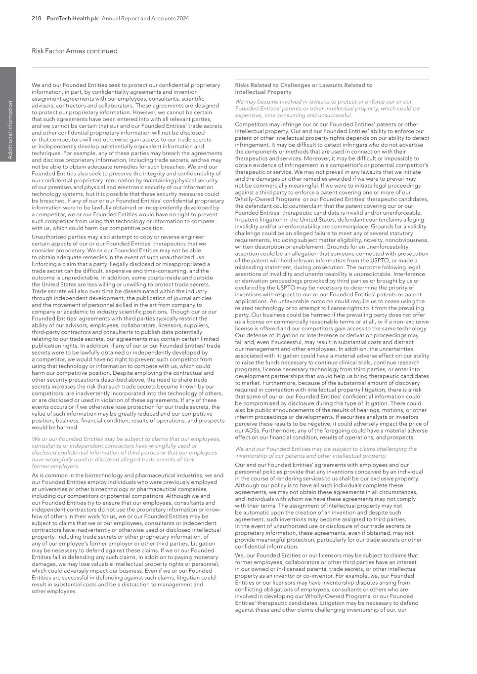 210 PureTech Health plc Annual Report and Accounts 2024 Risk Factor Annex continued A d d it io na l i nf o rm at io n Risks Related to Challenges or Lawsuits Related to Intellectual Property We may become involved in lawsuits to protect or enforce our or our Founded Entities’ patents or other intellectual property, which could be expensive, time consuming and unsuccessful. Competitors may infringe our or our Founded Entities’ patents or other intellectual property. Our and our Founded Entities’ ability to enforce our patent or other intellectual property rights depends on our ability to detect infringement. It may be difficult to detect infringers who do not advertise the components or methods that are used in connection with their therapeutics and services. Moreover, it may be difficult or impossible to obtain evidence of infringement in a competitor’s or potential competitor’s therapeutic or service. We may not prevail in any lawsuits that we initiate and the damages or other remedies awarded if we were to prevail may not be commercially meaningful. If we were to initiate legal proceedings against a third party to enforce a patent covering one or more of our Wholly-Owned Programs or our Founded Entities’ therapeutic candidates, the defendant could counterclaim that the patent covering our or our Founded Entities’ therapeutic candidate is invalid and/or unenforceable. In patent litigation in the United States, defendant counterclaims alleging invalidity and/or unenforceability are commonplace. Grounds for a validity challenge could be an alleged failure to meet any of several statutory requirements, including subject matter eligibility, novelty, nonobviousness, written description or enablement. Grounds for an unenforceability assertion could be an allegation that someone connected with prosecution of the patent withheld relevant information from the USPTO, or made a misleading statement, during prosecution. The outcome following legal assertions of invalidity and unenforceability is unpredictable. Interference or derivation proceedings provoked by third parties or brought by us or declared by the USPTO may be necessary to determine the priority of inventions with respect to our or our Founded Entities’ patents or patent applications. An unfavorable outcome could require us to cease using the related technology or to attempt to license rights to it from the prevailing party. Our business could be harmed if the prevailing party does not offer us a license on commercially reasonable terms or at all, or if a non-exclusive license is offered and our competitors gain access to the same technology. Our defense of litigation or interference or derivation proceedings may fail and, even if successful, may result in substantial costs and distract our management and other employees. In addition, the uncertainties associated with litigation could have a material adverse effect on our ability to raise the funds necessary to continue clinical trials, continue research programs, license necessary technology from third parties, or enter into development partnerships that would help us bring therapeutic candidates to market. Furthermore, because of the substantial amount of discovery required in connection with intellectual property litigation, there is a risk that some of our or our Founded Entities’ confidential information could be compromised by disclosure during this type of litigation. There could also be public announcements of the results of hearings, motions, or other interim proceedings or developments. If securities analysts or investors perceive these results to be negative, it could adversely impact the price of our ADSs. Furthermore, any of the foregoing could have a material adverse effect on our financial condition, results of operations, and prospects. We and our Founded Entities may be subject to claims challenging the inventorship of our patents and other intellectual property. Our and our Founded Entities’ agreements with employees and our personnel policies provide that any inventions conceived by an individual in the course of rendering services to us shall be our exclusive property. Although our policy is to have all such individuals complete these agreements, we may not obtain these agreements in all circumstances, and individuals with whom we have these agreements may not comply with their terms. The assignment of intellectual property may not be automatic upon the creation of an invention and despite such agreement, such inventions may become assigned to third parties. In the event of unauthorized use or disclosure of our trade secrets or proprietary information, these agreements, even if obtained, may not provide meaningful protection, particularly for our trade secrets or other confidential information. We, our Founded Entities or our licensors may be subject to claims that former employees, collaborators or other third parties have an interest in our owned or in-licensed patents, trade secrets, or other intellectual property as an inventor or co-inventor. For example, we, our Founded Entities or our licensors may have inventorship disputes arising from conflicting obligations of employees, consultants or others who are involved in developing our Wholly-Owned Programs or our Founded Entities’ therapeutic candidates. Litigation may be necessary to defend against these and other claims challenging inventorship of our, our We and our Founded Entities seek to protect our confidential proprietary information, in part, by confidentiality agreements and invention assignment agreements with our employees, consultants, scientific advisors, contractors and collaborators. These agreements are designed to protect our proprietary information. However, we cannot be certain that such agreements have been entered into with all relevant parties, and we cannot be certain that our and our Founded Entities’ trade secrets and other confidential proprietary information wil