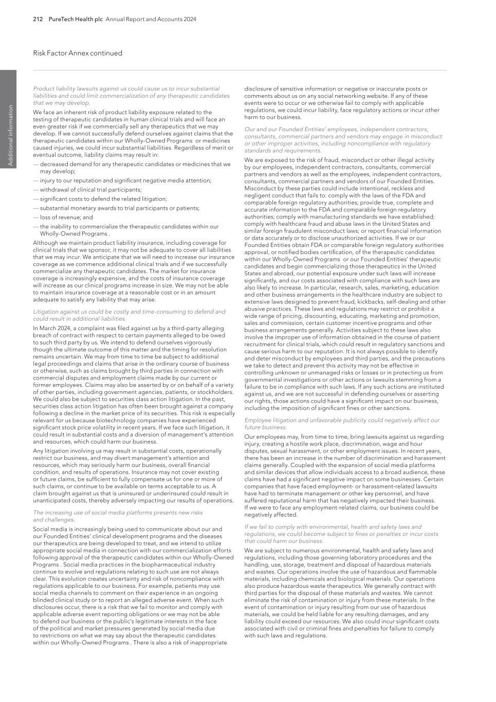 212 PureTech Health plc Annual Report and Accounts 2024 Risk Factor Annex continued A d d it io na l i nf o rm at io n disclosure of sensitive information or negative or inaccurate posts or comments about us on any social networking website. If any of these events were to occur or we otherwise fail to comply with applicable regulations, we could incur liability, face regulatory actions or incur other harm to our business. Our and our Founded Entities’ employees, independent contractors, consultants, commercial partners and vendors may engage in misconduct or other improper activities, including noncompliance with regulatory standards and requirements. We are exposed to the risk of fraud, misconduct or other illegal activity by our employees, independent contractors, consultants, commercial partners and vendors as well as the employees, independent contractors, consultants, commercial partners and vendors of our Founded Entities. Misconduct by these parties could include intentional, reckless and negligent conduct that fails to: comply with the laws of the FDA and comparable foreign regulatory authorities; provide true, complete and accurate information to the FDA and comparable foreign regulatory authorities; comply with manufacturing standards we have established; comply with healthcare fraud and abuse laws in the United States and similar foreign fraudulent misconduct laws; or report financial information or data accurately or to disclose unauthorized activities. If we or our Founded Entities obtain FDA or comparable foreign regulatory authorities approval, or notified bodies certification, of the therapeutic candidates within our Wholly-Owned Programs or our Founded Entities’ therapeutic candidates and begin commercializing those therapeutics in the United States and abroad, our potential exposure under such laws will increase significantly, and our costs associated with compliance with such laws are also likely to increase. In particular, research, sales, marketing, education and other business arrangements in the healthcare industry are subject to extensive laws designed to prevent fraud, kickbacks, self-dealing and other abusive practices. These laws and regulations may restrict or prohibit a wide range of pricing, discounting, educating, marketing and promotion, sales and commission, certain customer incentive programs and other business arrangements generally. Activities subject to these laws also involve the improper use of information obtained in the course of patient recruitment for clinical trials, which could result in regulatory sanctions and cause serious harm to our reputation. It is not always possible to identify and deter misconduct by employees and third parties, and the precautions we take to detect and prevent this activity may not be effective in controlling unknown or unmanaged risks or losses or in protecting us from governmental investigations or other actions or lawsuits stemming from a failure to be in compliance with such laws. If any such actions are instituted against us, and we are not successful in defending ourselves or asserting our rights, those actions could have a significant impact on our business, including the imposition of significant fines or other sanctions. Employee litigation and unfavorable publicity could negatively affect our future business. Our employees may, from time to time, bring lawsuits against us regarding injury, creating a hostile work place, discrimination, wage and hour disputes, sexual harassment, or other employment issues. In recent years, there has been an increase in the number of discrimination and harassment claims generally. Coupled with the expansion of social media platforms and similar devices that allow individuals access to a broad audience, these claims have had a significant negative impact on some businesses. Certain companies that have faced employment- or harassment-related lawsuits have had to terminate management or other key personnel, and have suffered reputational harm that has negatively impacted their business. If we were to face any employment-related claims, our business could be negatively affected. If we fail to comply with environmental, health and safety laws and regulations, we could become subject to fines or penalties or incur costs that could harm our business. We are subject to numerous environmental, health and safety laws and regulations, including those governing laboratory procedures and the handling, use, storage, treatment and disposal of hazardous materials and wastes. Our operations involve the use of hazardous and flammable materials, including chemicals and biological materials. Our operations also produce hazardous waste therapeutics. We generally contract with third parties for the disposal of these materials and wastes. We cannot eliminate the risk of contamination or injury from these materials. In the event of contamination or injury resulting from our use of hazardous materials, we could be held liable for any resulting damages, and any liability could exceed our resources. We also could incur significant costs associated with civil or criminal fines and penalties for failure to comply with such laws and regulations. Product liability lawsuits against us could cause us to incur substantial liabilities and could limit commercialization of any therapeutic candidates that we may develop. We face an inherent risk of product liability exposure related to the testing of therapeutic candidates in human clinical trials and will face an even greater risk if we commercially sell any therapeutics that we may develop. If we cannot successfully defend ourselves against claims that the therapeutic candidates within our Wholly-Owned Programs or medicines caused injuries, we could incur substantial liabilities. Regardless of merit or eventual outcome, liability claims may result in: — decreased demand for any therapeutic candidates or medicines that we may develop; — injury to our re