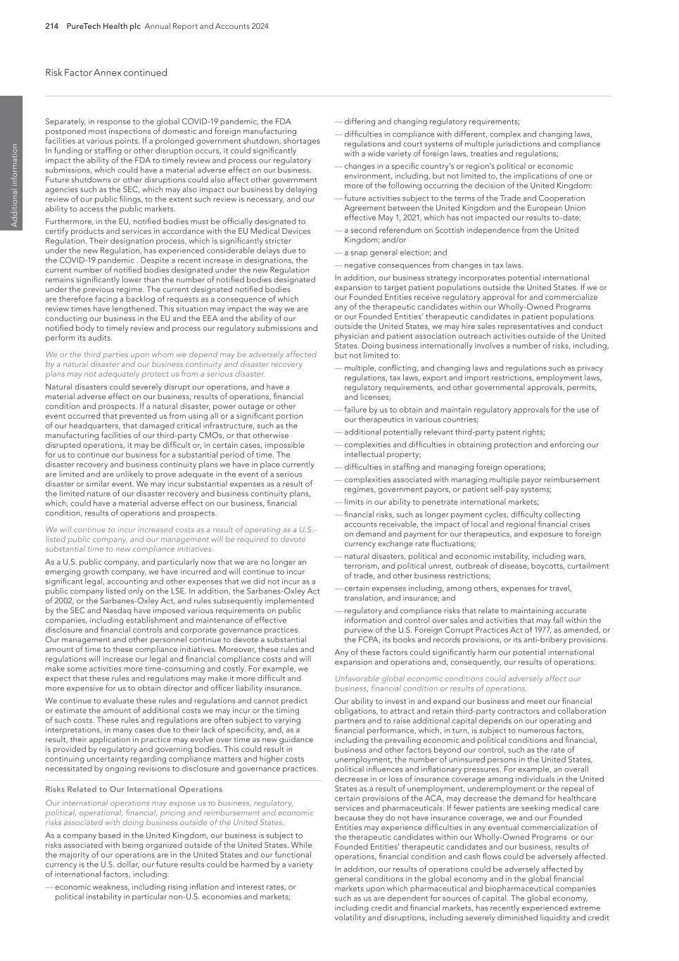 214 PureTech Health plc Annual Report and Accounts 2024 Risk Factor Annex continued A d d it io na l i nf o rm at io n — differing and changing regulatory requirements; — difficulties in compliance with different, complex and changing laws, regulations and court systems of multiple jurisdictions and compliance with a wide variety of foreign laws, treaties and regulations; — changes in a specific country’s or region’s political or economic environment, including, but not limited to, the implications of one or more of the following occurring the decision of the United Kingdom: — future activities subject to the terms of the Trade and Cooperation Agreement between the United Kingdom and the European Union effective May 1, 2021, which has not impacted our results to-date; — a second referendum on Scottish independence from the United Kingdom; and/or — a snap general election; and — negative consequences from changes in tax laws. In addition, our business strategy incorporates potential international expansion to target patient populations outside the United States. If we or our Founded Entities receive regulatory approval for and commercialize any of the therapeutic candidates within our Wholly-Owned Programs or our Founded Entities’ therapeutic candidates in patient populations outside the United States, we may hire sales representatives and conduct physician and patient association outreach activities outside of the United States. Doing business internationally involves a number of risks, including, but not limited to: — multiple, conflicting, and changing laws and regulations such as privacy regulations, tax laws, export and import restrictions, employment laws, regulatory requirements, and other governmental approvals, permits, and licenses; — failure by us to obtain and maintain regulatory approvals for the use of our therapeutics in various countries; — additional potentially relevant third-party patent rights; — complexities and difficulties in obtaining protection and enforcing our intellectual property; — difficulties in staffing and managing foreign operations; — complexities associated with managing multiple payor reimbursement regimes, government payors, or patient self-pay systems; — limits in our ability to penetrate international markets; — financial risks, such as longer payment cycles, difficulty collecting accounts receivable, the impact of local and regional financial crises on demand and payment for our therapeutics, and exposure to foreign currency exchange rate fluctuations; — natural disasters, political and economic instability, including wars, terrorism, and political unrest, outbreak of disease, boycotts, curtailment of trade, and other business restrictions; — certain expenses including, among others, expenses for travel, translation, and insurance; and — regulatory and compliance risks that relate to maintaining accurate information and control over sales and activities that may fall within the purview of the U.S. Foreign Corrupt Practices Act of 1977, as amended, or the FCPA, its books and records provisions, or its anti-bribery provisions. Any of these factors could significantly harm our potential international expansion and operations and, consequently, our results of operations. Unfavorable global economic conditions could adversely affect our business, financial condition or results of operations. Our ability to invest in and expand our business and meet our financial obligations, to attract and retain third-party contractors and collaboration partners and to raise additional capital depends on our operating and financial performance, which, in turn, is subject to numerous factors, including the prevailing economic and political conditions and financial, business and other factors beyond our control, such as the rate of unemployment, the number of uninsured persons in the United States, political influences and inflationary pressures. For example, an overall decrease in or loss of insurance coverage among individuals in the United States as a result of unemployment, underemployment or the repeal of certain provisions of the ACA, may decrease the demand for healthcare services and pharmaceuticals. If fewer patients are seeking medical care because they do not have insurance coverage, we and our Founded Entities may experience difficulties in any eventual commercialization of the therapeutic candidates within our Wholly-Owned Programs or our Founded Entities’ therapeutic candidates and our business, results of operations, financial condition and cash flows could be adversely affected. In addition, our results of operations could be adversely affected by general conditions in the global economy and in the global financial markets upon which pharmaceutical and biopharmaceutical companies such as us are dependent for sources of capital. The global economy, including credit and financial markets, has recently experienced extreme volatility and disruptions, including severely diminished liquidity and credit Separately, in response to the global COVID-19 pandemic, the FDA postponed most inspections of domestic and foreign manufacturing facilities at various points. If a prolonged government shutdown, shortages In funding or staffing or other disruption occurs, it could significantly impact the ability of the FDA to timely review and process our regulatory submissions, which could have a material adverse effect on our business. Future shutdowns or other disruptions could also affect other government agencies such as the SEC, which may also impact our business by delaying review of our public filings, to the extent such review is necessary, and our ability to access the public markets. Furthermore, in the EU, notified bodies must be officially designated to certify products and services in accordance with the EU Medical Devices Regulation. Their designation process, which is significantly stricter under the new Regulation, h