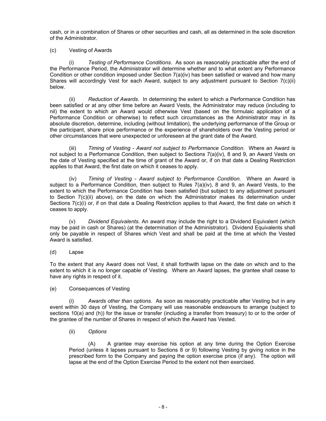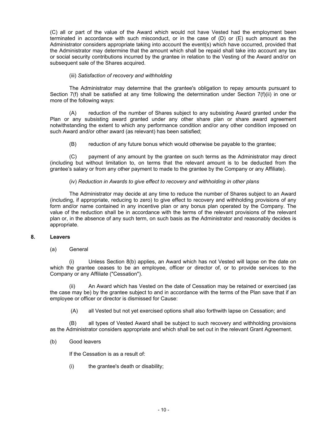 The Committee shall, in its sole discretion, determine the manner of recovery of any Erroneously Awarded Compensation, which may include, without limitation, reduction or cancellation by the Company or an affiliate of the Company of Incentive-Based Compensation or Erroneously Awarded Compensation, reimbursement or repayment by any person subject to this Policy of the Erroneously Awarded Compensation, and, to the extent permitted by law, an offset of the Erroneously Awarded Compensation against other compensation payable by the Company or an affiliate of the Company to such person. Notwithstanding the foregoing, unless otherwise prohibited by the Applicable Rules, to the extent this Policy provides for recovery of Erroneously Awarded Compensation already recovered by the Company pursuant to Section 304 of the Sarbanes-Oxley Act of 2002 or Other Recovery Arrangements, the amount of Erroneously Awarded Compensation already recovered by the Company from the recipient of such Erroneously Awarded Compensation may be credited to the amount of Erroneously Awarded Compensation required to be recovered pursuant to this Policy from such person.