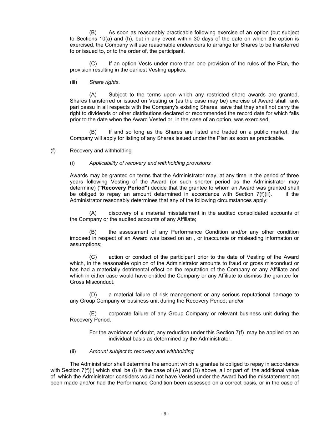 “Impracticable” means (a) the direct expenses paid to third parties to assist in enforcing recovery would exceed the Erroneously Awarded Compensation; provided that the Company has (i) made reasonable attempts to recover the Erroneously Awarded Compensation, (ii) documented such attempt(s), and (iii) provided such documentation to the relevant listing exchange or association, (b) to the extent permitted by the Applicable Rules, the recovery would violate the Company’s home country laws pursuant to an opinion of home country counsel; provided that the Company has (i) obtained an opinion of home country counsel, acceptable to the relevant listing exchange or association, that recovery would result in such violation, and (ii) provided such opinion to the relevant listing exchange or association, or (c) recovery would likely cause an otherwise tax-qualified retirement plan, under which benefits are broadly available to employees of the Company, to fail to meet the requirements of 26 U.S.C. 401(a)(13) or 26 U.S.C. 411(a) and the regulations thereunder.